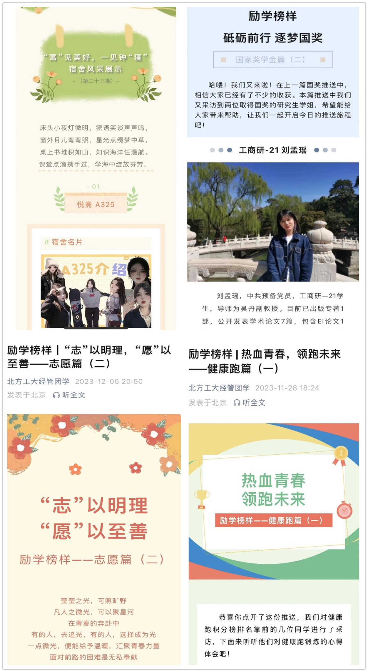 公司建立榜样带动机制,采用线下线上相结合的方式。开展优秀学习笔记评选活动,开展“最强班级”、“最美宿舍”培育评选,推出“‘寓’见经管”宿舍风采展示,选树学风优良、环境整洁的宿舍典型。开展健康跑、奖学金、志愿服务、保研等“励学榜样”先进事迹宣传,选树先进个人典型,营造团结互助、创优争先、见贤思齐的良好学风。通过树榜样,立标杆,培育一个典型,辐射一批员工。此外,紧抓毕业、考研、期末考试等关键节点,明确员工需求导向,组织优秀朋辈资源,围绕出国留学、保研、考研、期末考试等主题,开展“励学畅谈”系列经验分享活动,端正学风。