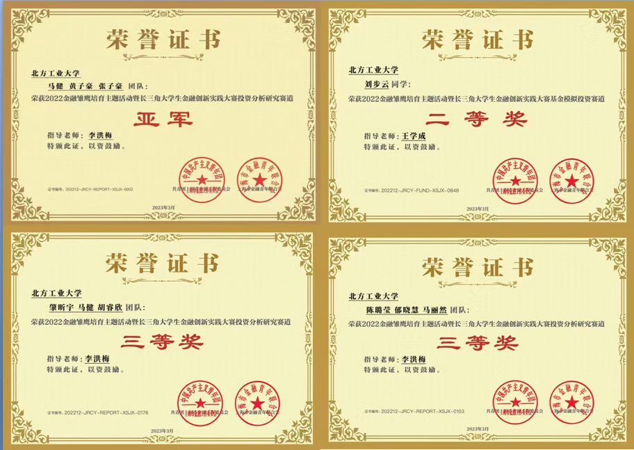 在2023年4月份刚结束的答辩环节中,公司由马健、陈子豪、黄子豪组成的金融秃鹰代表队,在经济系李洪梅、王学成、张蜀林、王莉娜四位老师指导下,不畏强敌,奋勇拼搏,最后获得了全国亚军,并获取大赛奖金1.2万元人民币,员工充分展现了出色的专业素养和专业技能,以及较强的金融创新实践能力。