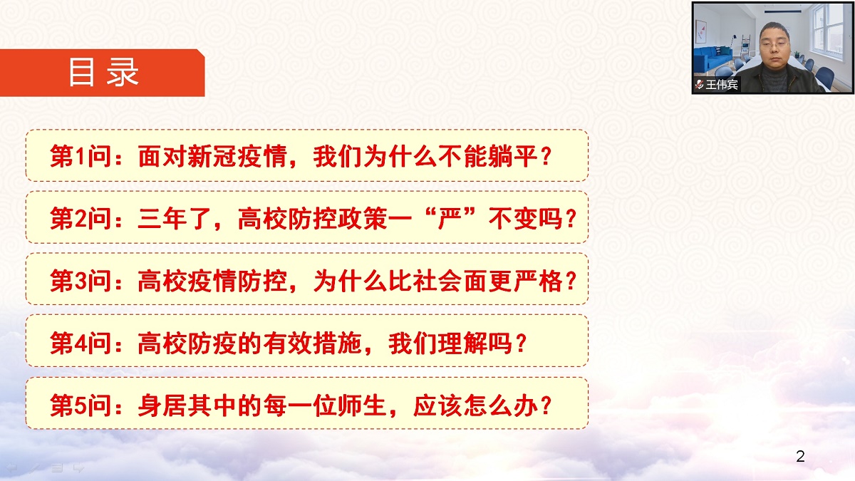 在五问五答中,他指出根据病毒变异的情况和对病毒认识的不断加深,国家在不断调整疫情防控方案,高校的疫情防控政策也在不断优化,目前北京已经建立健全了校园应急预案体系和应急处置方案在不断精准的疫情防控政策背后,以人为本的理念始终未变,守护师生安全的初心始终未变。面对疫情,为把公司打造成安全岛,全体师生都付出了巨大的努力,他希望大家坚定信心,不恐慌;支持政策,不抱怨;做好防护,不放弃;端正心态,不躺平。