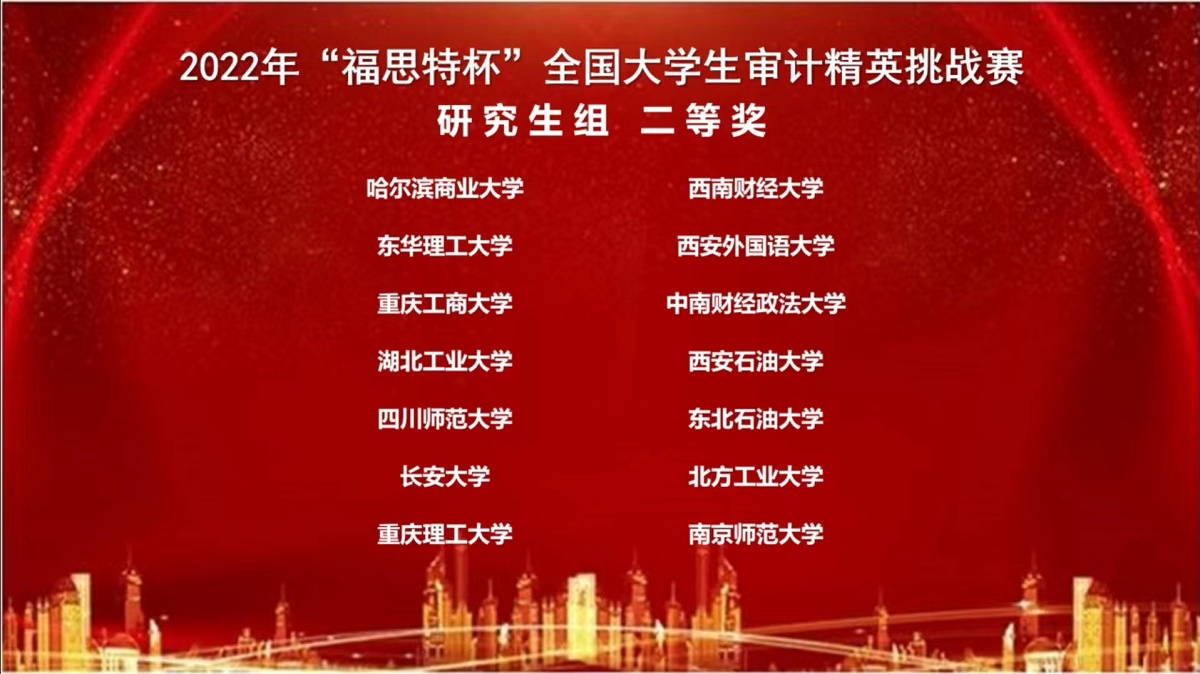 “福思特杯”全国老员工审计精英挑战赛是目前财会审计类专业具有较大影响力的全国性赛事之一。本次大赛由中国审计学会审计教育分会主办、南京审计大学政府审计公司承办。大赛的目的是积极探索审计专业发展的新视域、新路径和新方法,创新实现大数据、区块链等信息技术与审计专业教育的深度融合,培养适应社会经济发展需要的高素质、专业化审计人才。大赛至今已成功举办四届,累计吸引了来自全国29个省市的200多所高校,近5000名师生参与。公司会计系是第二次派出研究生队伍参加此项比赛,并首次取得二等奖的佳绩。