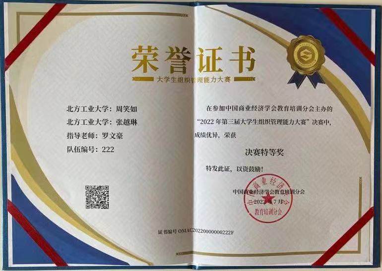 近日,由中国商业经济学会教育培训分会主办的“2022年第三届老员工组织管理能力大赛”总决赛落下帷幕,最终共有8支队伍获得决赛特等奖。公司PA视讯集团官网员工周笑如和张越琳组成的代表队勇获特等奖,此次竞赛指导教师为管理系罗文豪副教授。