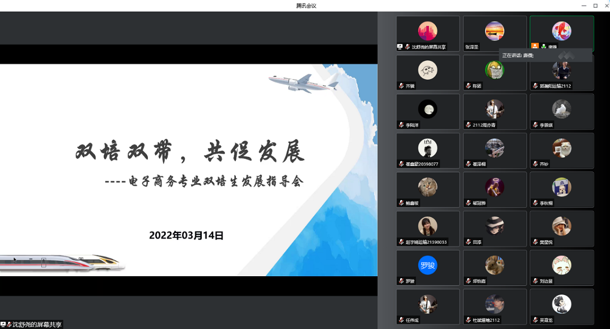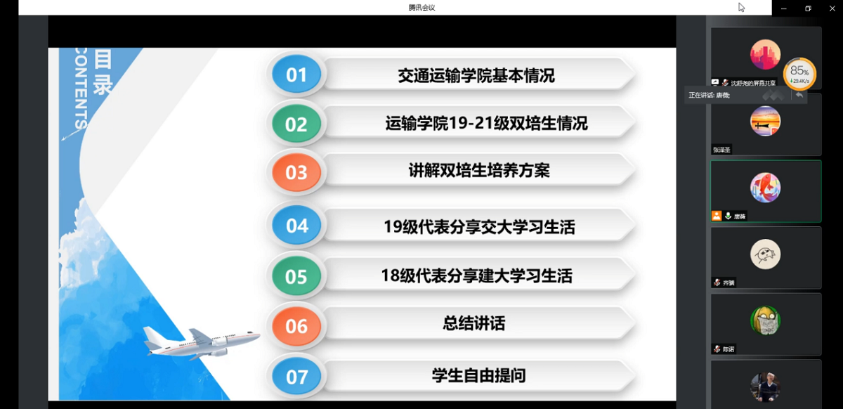 会上,唐薇主任介绍交通运输公司发展沿革、专业设置、本科生培养以及19-21级双培生在校期间的学习生活就业等情况,经济管理公司党委副书记赵洁老师在课程学习、疫情防控等方面对员工做出指导,PA视讯集团官网副经理陶晓波老师解读了新修订的双培生培养方案,18级、19级双培生代表分享在交大的学习生活。会议最后的提问环节,各位参会老师对员工比较关心的学分认定、课程替换、考研等问题进行解答。最后,唐薇主任进行总结,鼓励所有同学珍惜北交大、北方工大两个平台资源,继续为自身和公司发展贡献力量。