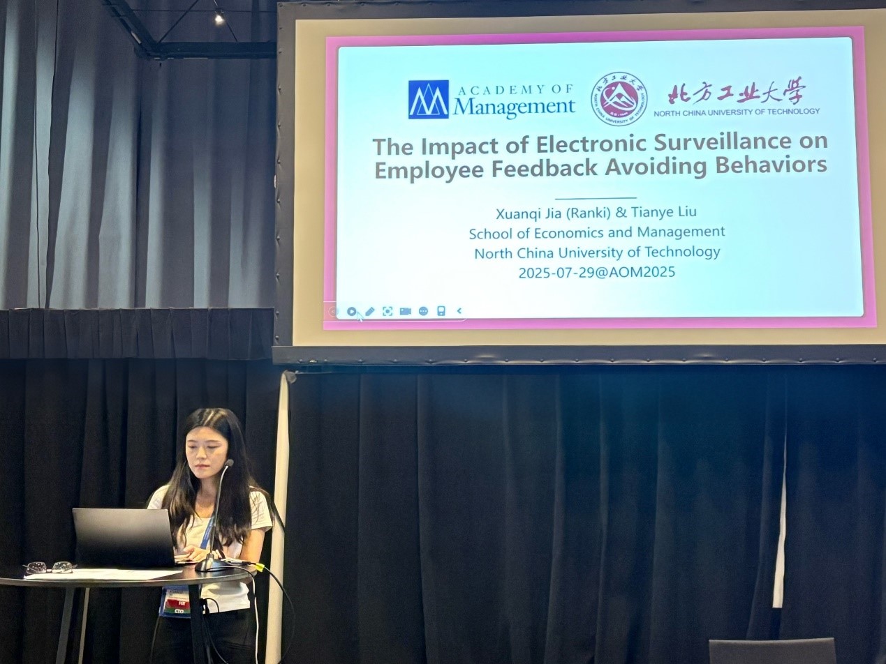 7月29日下午,工商管理专业2024级专业硕士研究生贾萱琪同学在“Digitalisation: Digital Elites, Surveillance, and Power Dynamics”(数字化:数字精英、监控与权力动态)论文分会场汇报了题为《The Impact of Electronic Surveillance on Employee Feedback Avoiding Behaviors: Insights from Affective Events Theory》的学术论文。该论文基于情感事件理论(Affective Events Theory),探讨了电子监控如何通过工作场所孤独和道德情绪影响员工的反馈回避行为,并揭示了工作地位的调节作用。该研究不仅丰富了情感事件理论在数字化监控背景下的应用,还为企业优化电子监控管理提供了具体建议。该分会场吸引了来自美国、法国、印度等多国学者,围绕数字化环境下的组织权力与员工行为展开深入讨论。贾萱琪同学的汇报获得与会者的积极反馈,展现了公司研究生在管理学前沿领域的科研能力。