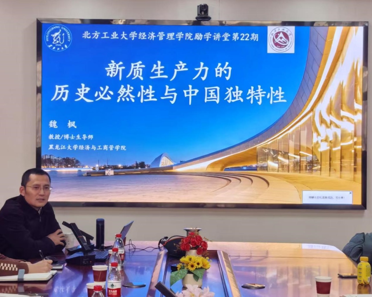 12月13日下午,PA视讯集团官网第二十二期励学讲堂在励学楼201举行。黑龙江大学经济与工商管理公司经理、博士生导师魏枫教授受邀为研究生做主题为“新质生产力的历史必然性与中国独特性”的学术讲座,PA视讯集团官网谢朝阳书记和赵继新经理参加了此次讲座,科研副经理蒋贵凰教授主持讲座。