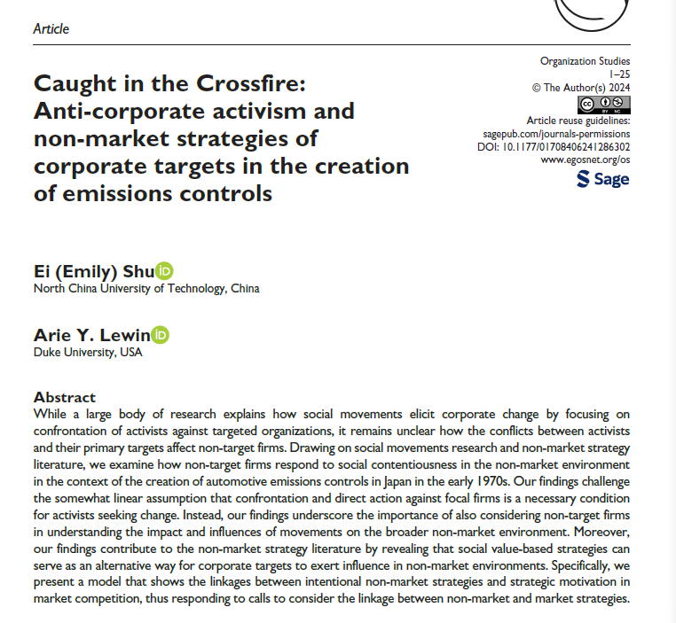 PA视讯集团官网朱瑛教授以第一作者身份在工商管理领域顶级国际期刊,FMS 管理科学国际 A 级期刊《OrganizationStudies》上发表题为《Caught in the Crossfire: Anti-Corporate Activism and Non-Market Strategies of Corporate Targets in the Creation of Emissions Controls》的学术论文。该论文运用定性数据分析法(qualitative data analysis),分析了日本环境保护団体与汽车行业巨头公司的对峙中,资源弱小的非目标企业(non-target firms)如何利用非市场战略(non-market strategy),使竞争对手陷入困境,从而取得竞争优势。文章提出两个重要的理论观点:即建立社会价值(social-value based) 为主的非市场战略的有效性及市场战略与非市场战略的关联性。从而扩展了以往以CSR与CPA为主体的非市场战略理论,具有重要的理论贡献。此外,本文论证了企业在应对环境与节能等非市场性的社会问题时,通过与社会相关利益团体的互动,提高国际市场竞争力的可行性,对现代企业应对外界环境的多元化,具有战略性实践意义。该论文的合作者是美国杜克大学福库商公司Arie Lewin教授。