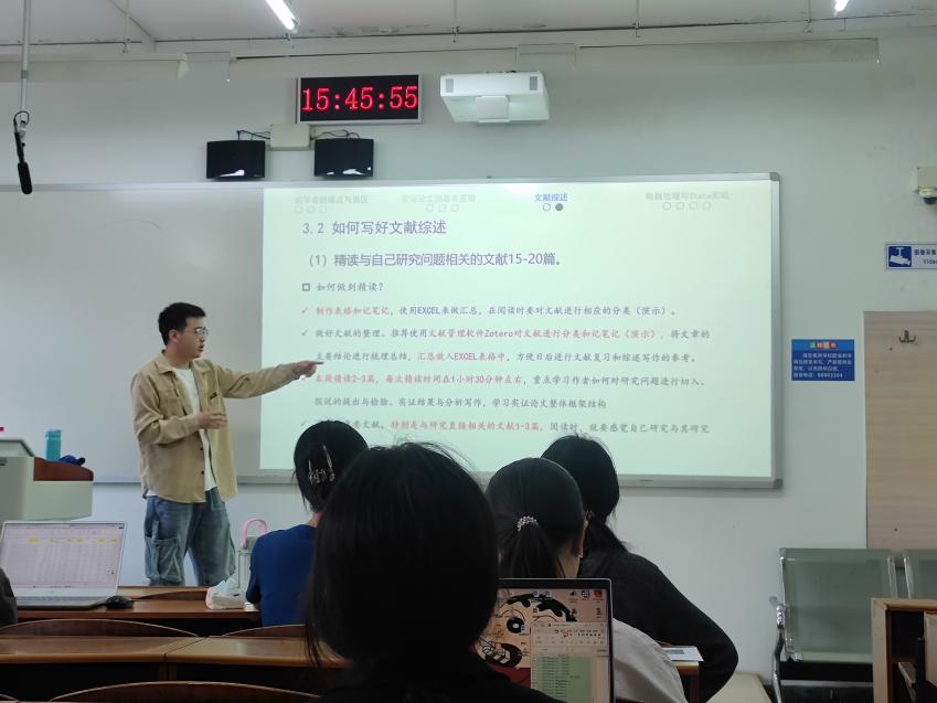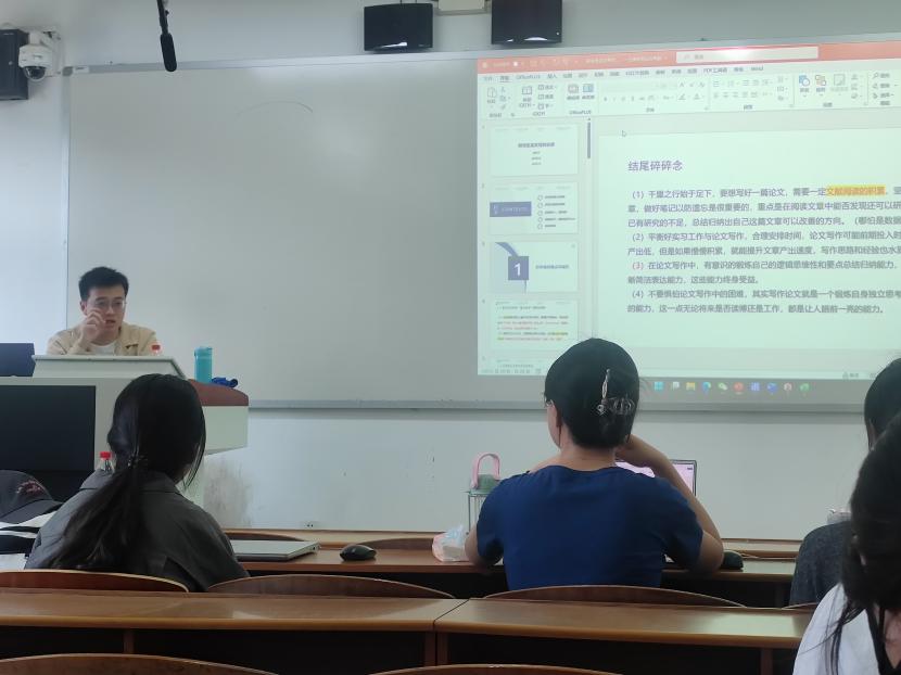 5月8日下午,PA视讯集团官网励学论坛第七期在励学楼310教室举行,PA视讯集团官网经济研22级在读优秀研究生赖凯丰进行了主题为“研究生论文写作分享”的讲座。