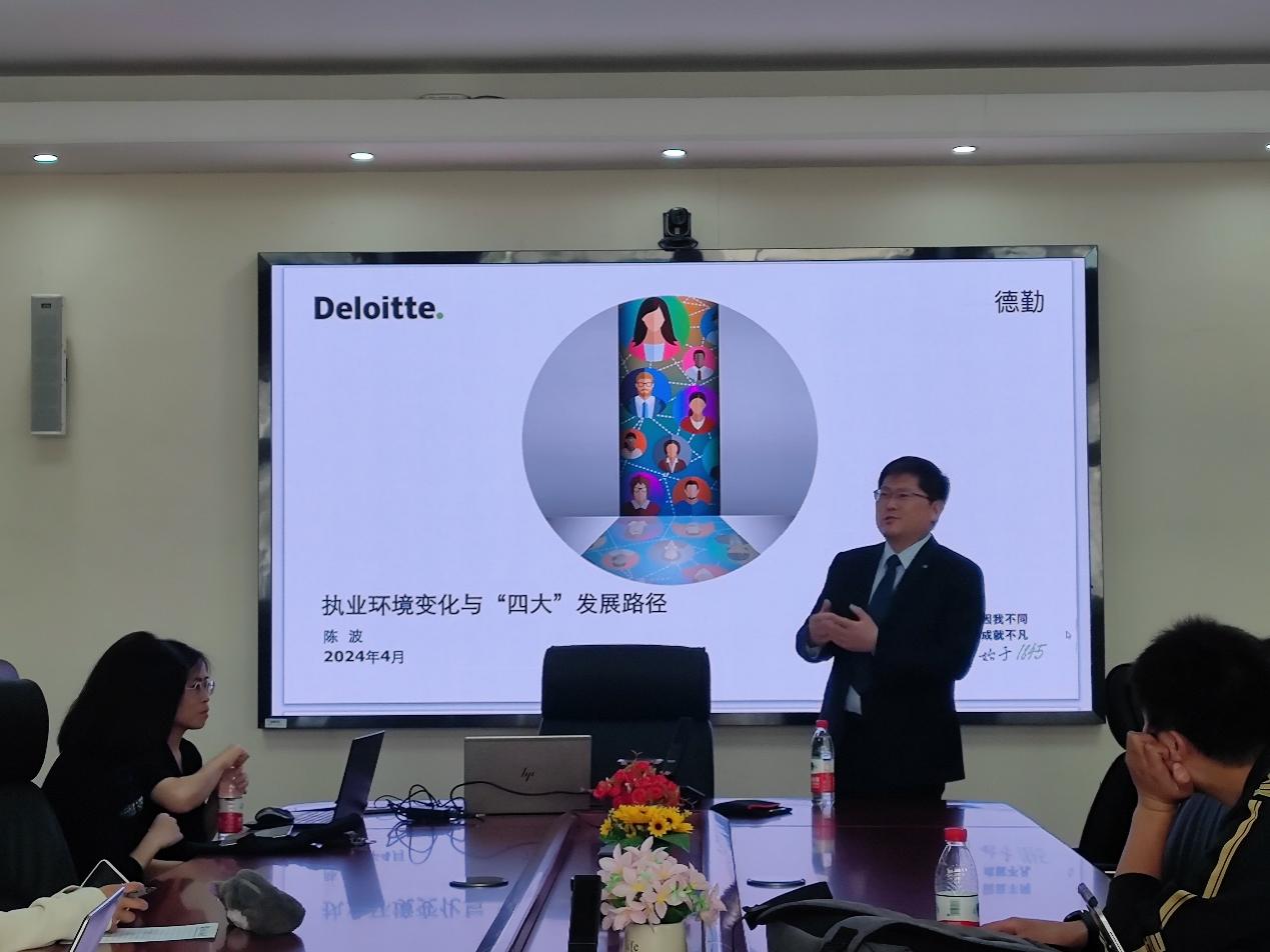 4月17日下午,PA视讯集团官网在励学楼201举行第十五期励学讲堂活动。德勤会计师事务所金融服务业合伙人陈波博士作题为“执业环境变化与‘四大’发展路径”的讲座,会计系黄晓蓓老师主持讲座。