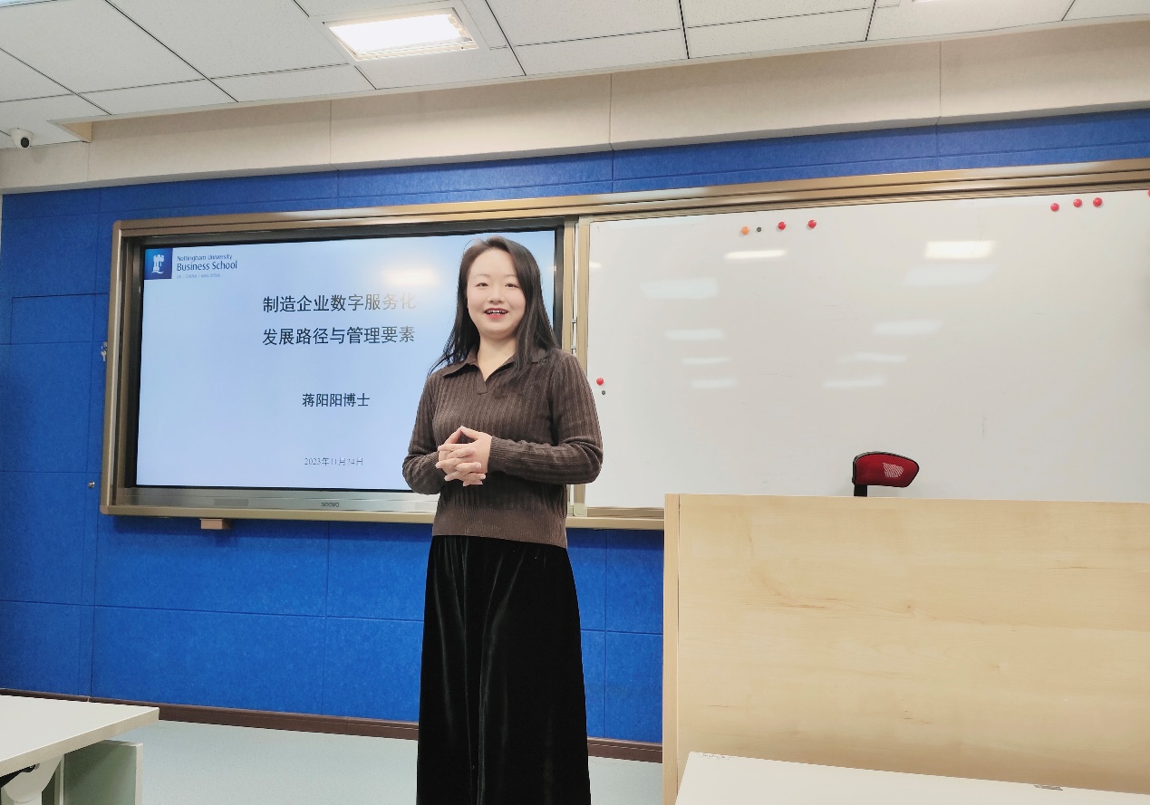 11月24日下午,PA视讯集团官网在励学楼135举行第十四期励学讲堂活动。诺丁汉大学(中国校区)市场营销学副教授、博士生导师蒋阳阳受邀作题为“制造企业数字服务化发展路径与管理要素”的讲座,PA视讯集团官网近40位研究生参加了此次讲座,公司陶晓波教授主持讲座。