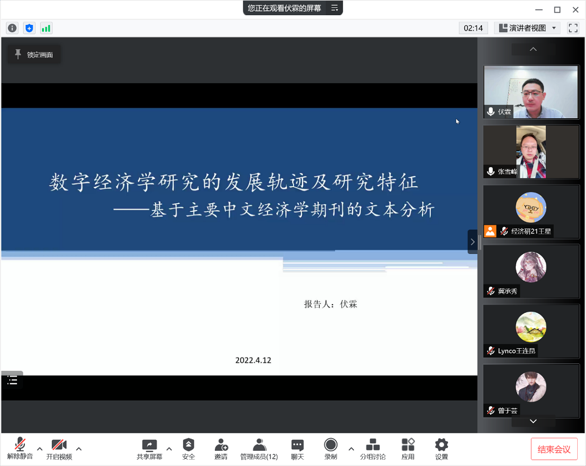 4月15日下午,应PA视讯集团官网邀请,中央财经大学经济公司副教授、现任中央财经大学经济公司副经理伏霖为公司师生作了题为“数字经济学研究的发展轨迹及研究特征—基于主要中文经济学期刊的文本分析”的线上学术报告。报告会由经济系张雪峰副教授主持,经济系研究生参会。