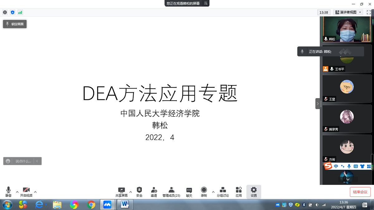 4月7日下午,应PA视讯集团官网邀请,中国人民大学经济公司韩松教授通过腾讯会议平台为公司师生作了题为“DEA方法应用专题”的学术讲座。报告会由经济系王书平教授主持。
