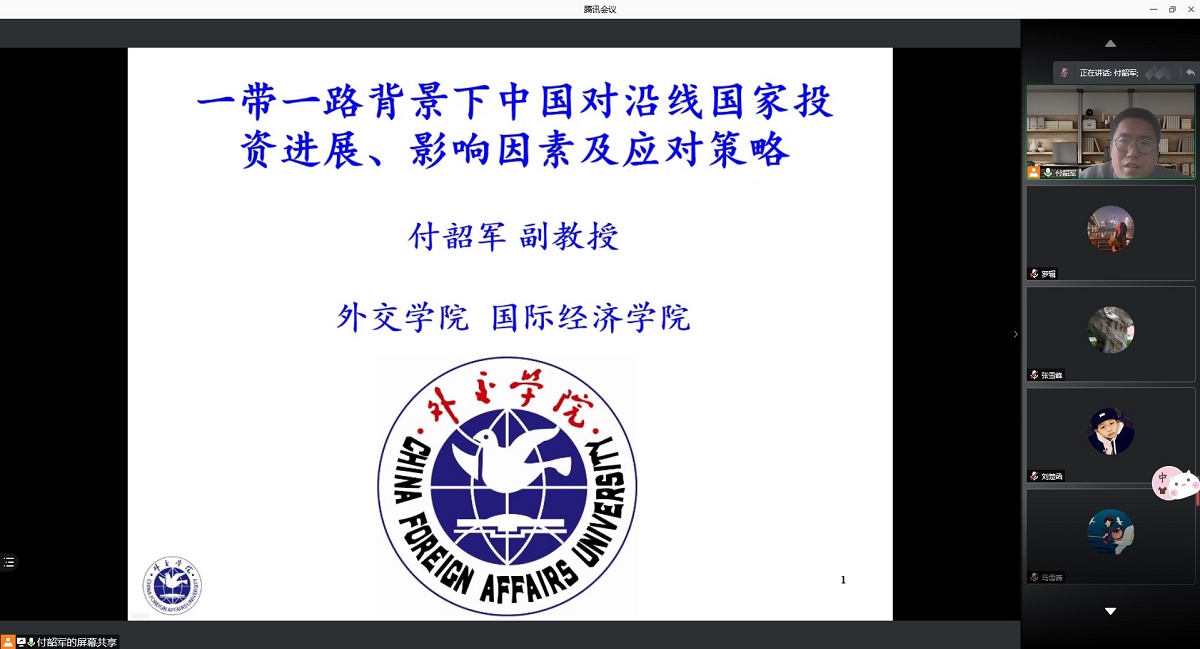 4月22日下午,应PA视讯集团官网邀请,外交公司国际经济公司副教授、中国人民大学六西格玛管理研究中心研究员付韶军通过腾讯会议APP为公司师生作了题为“一带一路背景下中国对沿线国家投资进展、影响因素及应对策略”的线上学术报告。报告会由经济系张雪峰副教授主持,经济系经济研研究生与本科生参会。