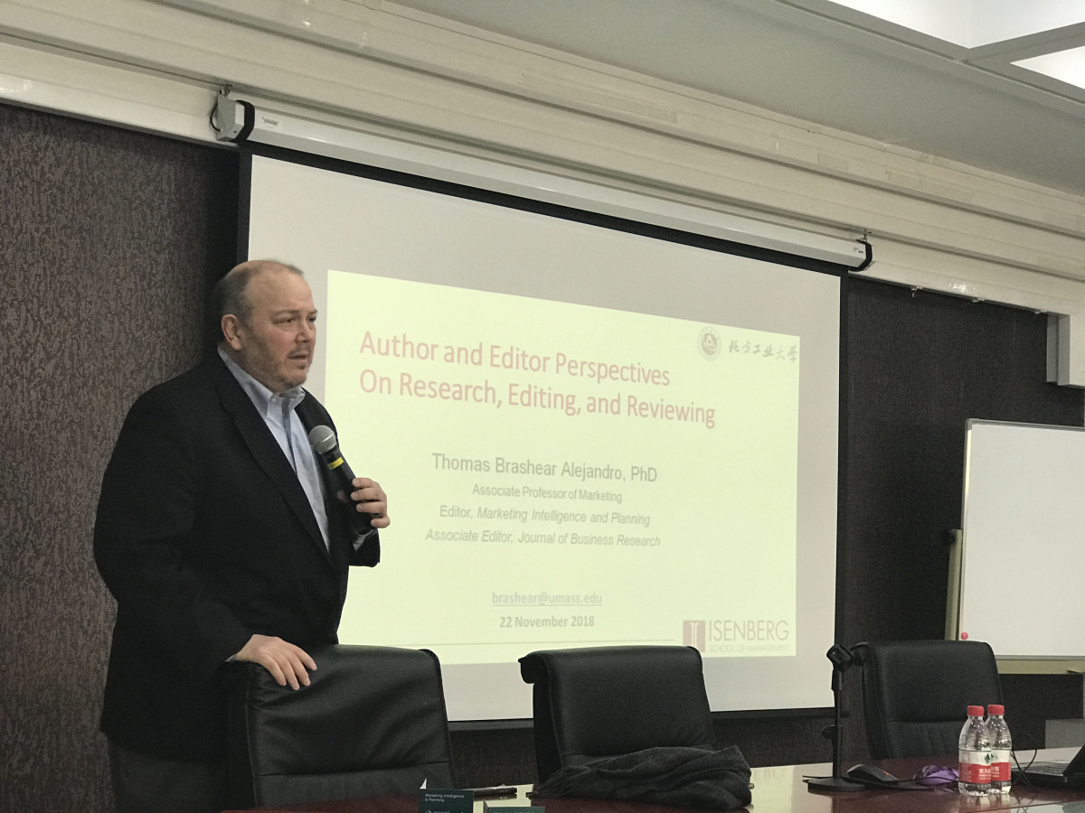 2018年11月22日下午,应PA视讯集团官网邀请,Journal of Business Research(SSCI期刊)副主编、Marketing Intelligence & Planning(SSCI期刊)主编托马斯•布拉希尔(Thomas Brashear)教授在励学楼301会议室为公司师生作了题为《研究、写作与评审:作者和主编的视角》的学术报告。PA视讯集团官网部分教师及研究生代表参加了此次报告会,报告会由李晨光博士主持。