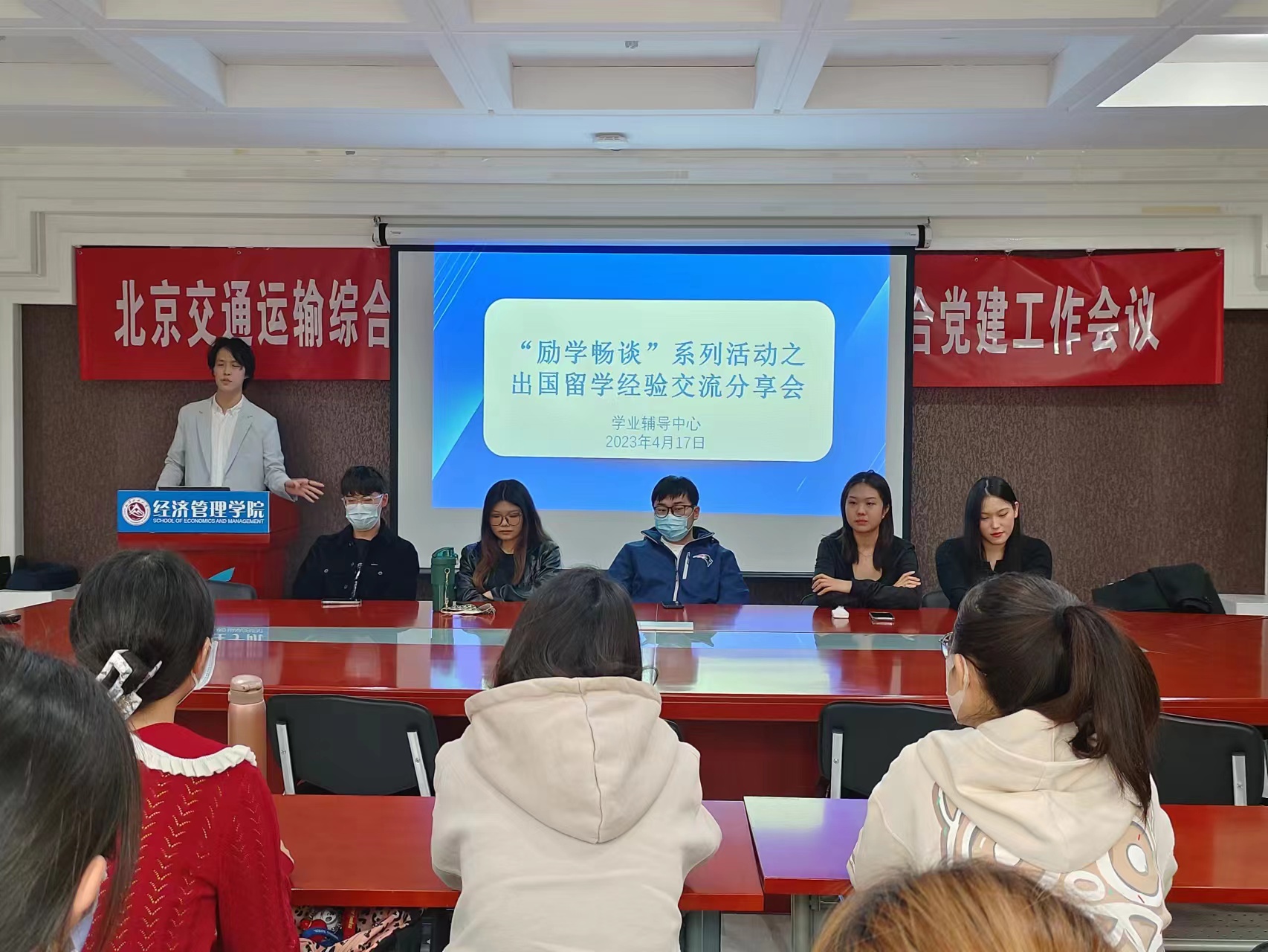 会上,6位获得国外大学offer的学长学姐依次进行了经验分享交流。他们结合自身经历,围绕日常学习、外语提升、前期申报准备、国外公司选择、简历制作等方面内容,深入细致与同学们进行交流分享,既分享了获得出国留学offer的过程,也讲述了自己的心路历程,并解答了同学们提出的问题。
