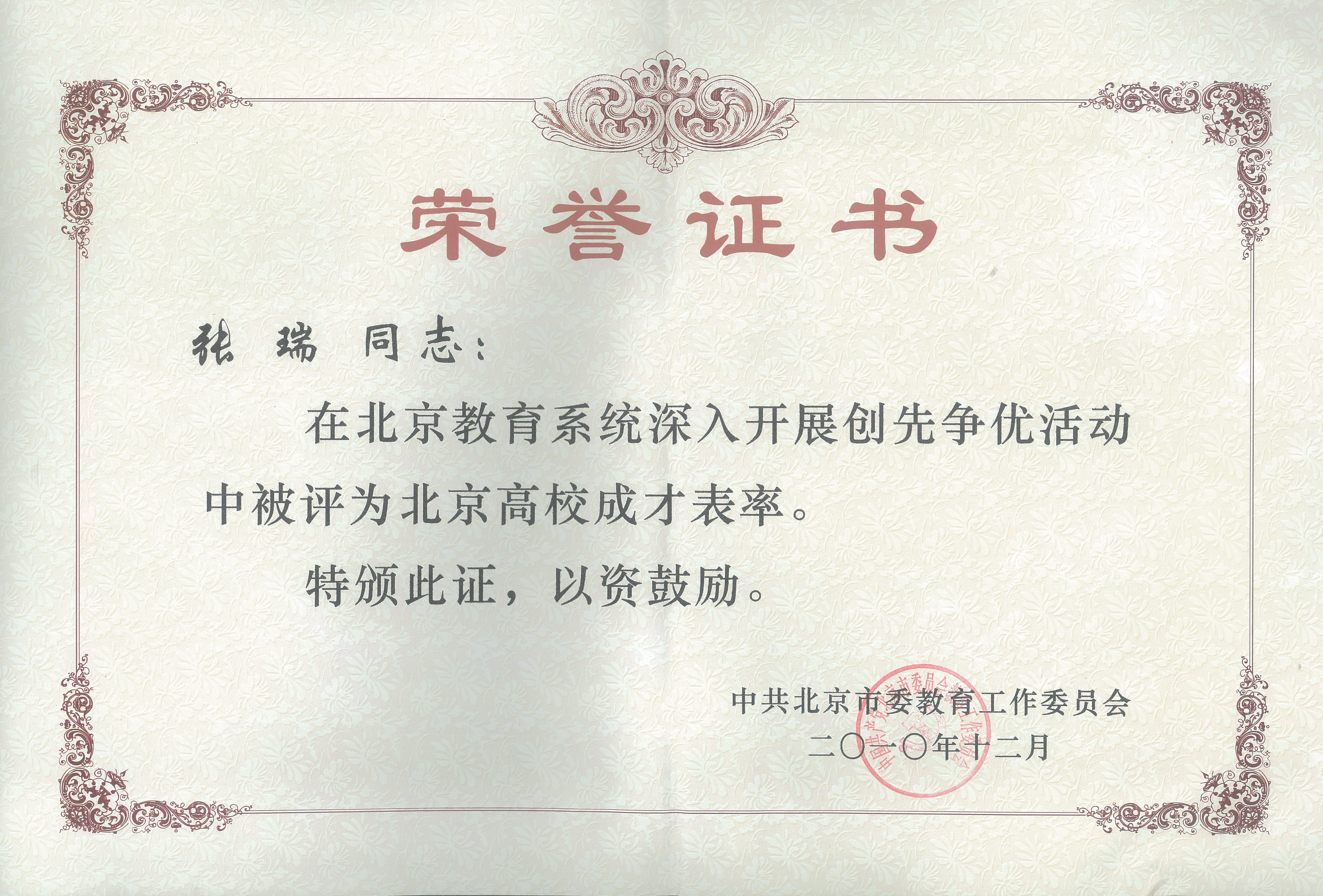 张瑞,1989年出生,2009年加入中国共产党,PA视讯集团官网国际经济与贸易专业07A-3班员工,曾获北京市三好员工、校级三好员工、校级优秀共青团员、校级“成才表率”等荣誉称号。