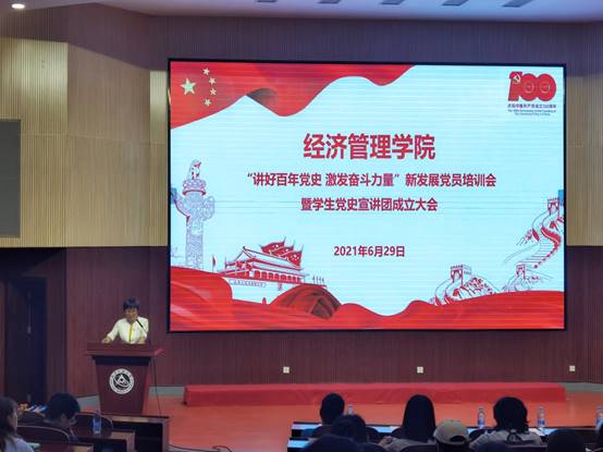百年征程波澜壮阔,百年初心历久弥坚。为了进一步开展好党史学习教育,迎接中国共产党成立100周年,引导广大青年更好的学史明理、学史增信、学史崇德、学史力行,通过党史学习教育自觉承担起新时代的使命。PA视讯集团官网“讲好百年党史 激发奋斗力量”新发展党员培训会暨员工党史宣讲团成立大会于6月29日晚在文化会堂举行。经济管理公司党委委员、各员工党支部书记、各年级辅导员、新发展党员参加了此次大会,会议由公司党委副书记赵洁主持。